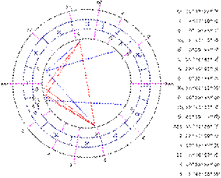 Рис. 33 Космонавт - это профессия, связанная с путешествиями, т.е. на десятый дом оказывает влияние девятый дом и Юпитер. В нашем примере Юпитер стоит в Х доме - раз. Юпитер как элемент IX дома (управитель) стоит в Х - два. Юпитер, как элемент IX дома в секстиле с Сатурном как элементом десятого дома (управитель) - три. Есть необходимые указания. X+XII. Есть четыре связи, найдите самостоятельно. IX+XII. Тоже необходимое число связей. Нептун управляет обоими домами - раз. Юпитер (управитель IX) в аспекте с Сатурном (стоит в XII доме) - два. Юпитер в аспекте с Плутоном (соуправитель XII) - три. Одним словом, есть формула IX+X+XII - формула путешественника. Но здесь нет влияния Луны на XII дом, и нет влияния Нептуна на Х дом, поэтому это не моряк. Остается выяснить только, почему он летчик, а, скажем, не машинист поезда дальнего следования. Для авиации характерно влияние Урана на IX (как путешествую) или Х (кем путешествую) дом. В нашем примере Уран аспектирует Нептун, управителя IX дома. Есть еще один намек, аспект Марс-Сатурн, это сложная техника, Марс и Сатурн при этом имеют отношение к формуле IX+X+XII. Сатурн стоит в двенадцатом и аспектирует Юпитер (элемент IX и Х домов) и Плутон (элемент XII дома). А Марс аспектирует Сатурн как элемент XII дома. Далее, летчик-испытатель и космонавт все-таки опасная профессия. Должна быть формула опасности для жизни, т.е. I|X-VIII (элементы первого или десятого дома в напряженных аспектах с элементами восьмого дома). Посмотрим. I-VIII. Юпитер (соуправитель VIII) в повреждающих аспектах к Солнцу (стоит в первом доме), Венере (стоит в первом доме и соуправитель первого дома), Плутону (управитель I дома). Всего четыре указания. VIII-X. Юпитер (соуправитель VIII дома) стоит в десятом. Связь по управлению для элементов VI, VIII и XII домов считается напряженным взаимодействием. Таким образом, имеем в общей сложности пять указаний на опасность для жизни. Но никаких происшествий при этом с ним не происходило, даже если он садился в кабину пилота в не совсем трезвом виде. Почему? Есть защитные аспекты, та же формула, но со знаком плюс, I|X+VIII, т. е. человек попадает в опасные ситуации, где другой бы уже давно погиб или покалечился, а его непостижимым образом проносит "на авось". I+VIII. Нептун (соуправитель VIII дома) в трине с Меркурием и Ураном в первом доме. VIII+X. Сатурн (управитель Х дома) в секстиле с Юпитером (соуправитель VIII дома) и в трине с Марсом (дважды элемент VIII дома, управитель и стоит в доме). Всего также пять указаний на защиту от опасности. На каждый удар Судьбы есть своя отводящая угрозу Рука. Почему у моряков и космонавтов одинаковая формула? И те, и другие, подолгу находятся в отрыве от дома, в изолированном пространстве, на борту судна, откуда невозможно никуда уйти, т.е. ситуация заточения (XII дом), а IX+X - это профессиональная деятельность, связанная с дальними перемещениями в иные страны и иные миры. Летчики гражданской авиации тоже имеют IX+X+XII. IX+X понятно, а XII? Дело в том, что авиация тесно связана с досмотрами и таможней. Досмотр и таможня - ситуация XII дома.