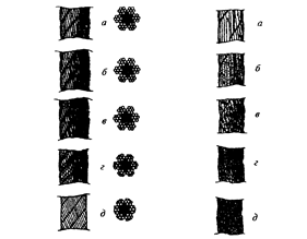 Рисунок 2. Сочетание обрывов проволок с их износом: а - в канате крестовой свивки; б - в канате односторонней свивки