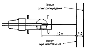 Для оценки работоспособности ограничителя или указателя опасного приближения к линии электропередачи (далее - ЛЭП) может быть использован макет ЛЭП, состоящий из трехфазной четырехпроводной воздушной электрической линии напряжением 220/380 В, выполненной из изолированных проводов, расположенных на опорах на высоте не менее 6 м, и размещенной на специальной площадке. Расстояние между опорами должно быть не менее 15 метров. Вдоль нижнего провода линии, на его уровне и на расстоянии от него (