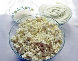 3. Пока застывает клубничное желе, приготовим творожный слой. Всё очень просто -смешать творог с сахаром и сметаной по вкусу. Тщательно растереть. В чашке развести в 100 мл воды 10 г желатина, тщательно размешать и добавить к творогу.