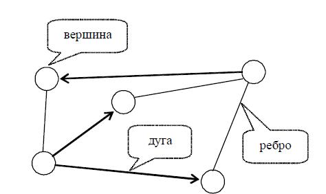 Кружки называются вершинами графа, линии со стрелками — дугами, без стрелок — ребрами. Граф, в котором направление линий не выделяется (все линии являются ребрами), называется неориентированным; граф, в котором направление линий принципиально (линии являются дугами) называется ориентированным.