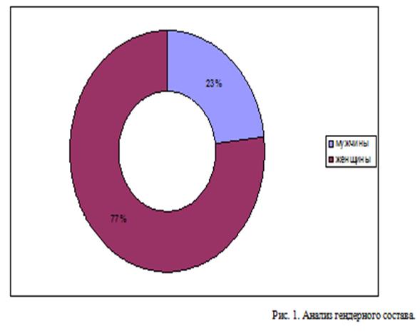2.3.1 Анализ гендерного состава На основании данных о медико-демографическом составе пациентов кардиологического отделения стационара за 2008 год можно сделать вывод, что почти 2/3 из них (77%) составили женщины и 1/3 из них (23%) –мужчины.