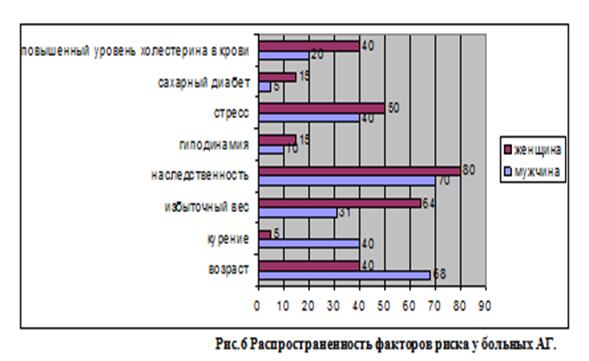 Результаты исследования: при сравнении распространенности сердечнососудистых заболеваний среди больных АГ выявлена большая частота курения у мужчин 40%, в то время как у женщин преобладает избыточный вес 64% и стресс 50%. Большое значения также имеет наследственность у мужчин 70%, у женщин 80%. Возраст у женщин составил 40%, у мужчин 68%. Повышенный холестерин в крови у женщин 40%, у мужчин 20%. Сахарный диабет, как фактор, усугубляющий, АГ преобладает у женщин 15%, у мужчин 5%. Неотъемлемым фактором риска также является гиподинамия у женщин 15%, у мужчин 10%. Для анализа регулярности приема лекарственных препаратов пациентами кардиологического отделения было проведено анкетирование 15 пациентов кардиологического отделения Елизаветинской больницы. Группа опрошенных включала женщин и мужчин 55-75 лет, поступивших на лечение с диагнозом артериальная гипертония. С учетом ответов были составлены диаграммы.