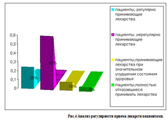 В ходе анализа регулярности приема лекарств пациентами были получены следующие результаты. Как это ни странно, но большая часть пациентов принимает лекарства нерегулярно 60%, пациентов, которые регулярно принимают лекарства только 25%. Пациенты, которые принимают лекарства только тогда, когда состояние здоровья совсем ухудшается 10%, а также есть и такие, которые вообще не принимают лекарства, их 5%. Мною было проведено исследование причин нерегулярного лечения больных с артериальной гипертонией, это стало возможным благодаря проведению анкетирования пациентов.