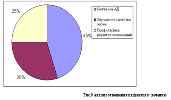 По данным исследования большинство пациентов считают, целью лечения является снижения АД 45%.Ссчитают, что целью лечения является улучшения качества жизни 30%, на профилактику развития осложнений как основную цель лечения указали 25%. Следовательно, проведение обучающих программ необходимо для информирования пациентах о заболевании, факторах риска, вызывающих или усугубляющих артериальную гипертонию и необходимости лечения.