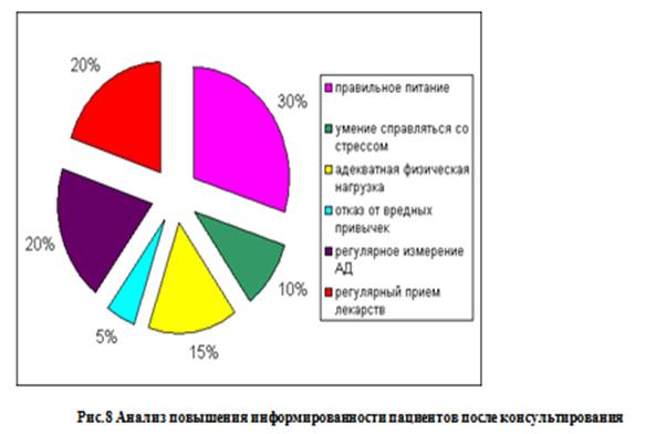 Результат исследования был получен следующий. После проведения беседы с пациентами о факторах риска и образу жизни, направленному на устранение или значительного снижения их 30% пациентов ответили, что будут контролировать свое питание и постараются изменить привычки питания. 10% опрошенных пациентов ответили, что постараются, по возможности, контролировать стрессовые ситуации и реакции на них, 15% пациентов ответили, что будут контролировать физическую активности и постараются адекватно состоянию повысить ее, 5% пациентов ответили, что откажутся или значительно снизят курение, 20% пациентов ответили, что будут, следить за регулярностью приема лекарств, и будут регулярно измерять АД.
