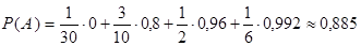 Найдем условные вероятности события А относительно каждой гипотезы, т.е. найдем вероятности того, что нарушения в уплате налогов будут выявлены хотя бы в одном из проверяемых трех банков в каждом рассматриваемом случае. Вероятность Р(А/Hi) можно найти по формуле (т.к. банки проверяются независимо один от другого) Р(А/Hi)=1-(1-р)i, где i=0; 1; 2; 3; р=0,8. Р(A/H0)=1-(1-p)0=1-(1-0,8)0=1-1=0, действительно, событие А и H0 несовместны. Р(A/H1)=1-(1-p)1=1-(1-0,8)1=1-1+0,8=0,8. Р(A/H2)=1-(1-p)2=1-(1-0,8)2=1-0,04=0,96. Р(A/H3)=1-(1-p)3=1-(1-0,8)3=1-(1-0,8)3=1-0,008=0,992. Используя формулу полной вероятности, найдем