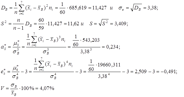· Найдем несмещенную оценку математического ожидания, т.е. выборочную cреднюю Чтобы найти несмещенные оценки дисперсии, показателей асимметрии и эксцесса, коэффициент вариации, составим таблицу.