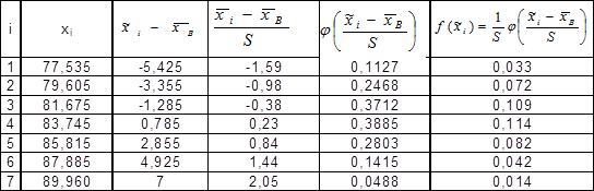 (См.таблицу 2 приложения) Замечание. Интервалы, содержащие малочисленные эмпирические частоты (ni<5) следует объединить, а соответствующие частоты сложить. Итак, получим таблицу