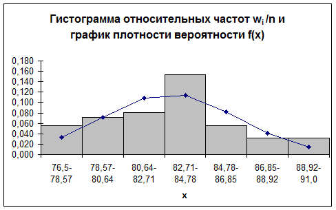 (См. таблицу 1 приложения) Построим график плотности вероятности f(х) на том же чертеже, что и гистограмма: соединим последовательно точки (