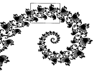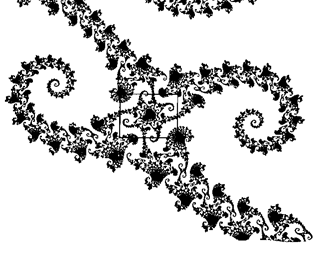Мандельброт рассматривает математические аналоги природных форм и уточняет представление о фракталах – особых геометрических множествах, форма которых принципиально отличается от традиционных геометрических форм типа точки, линии и плоскости. В качестве примера фракталов Мандельброт рассмотрел множества Жюлиа Мандельброта на комплексной плоскости. В основе построения этих множеств лежит рекуррентная процедура - процесс итерации z®f(z,c), где z -комплексная переменная, c - комплексная константа, f - нелинейная функция. Если x и y - координаты плоскости, то переменная z=x+iy, константа c=p+iq, а, например, нелинейную функцию можно выбрать такую: f(z,c)=z*z+c. Тогда если c=0, то все точки z делятся на три класса: 1.|z|<1 => аттрактор точки z - это точка (0,0), 2.|z|=1 => точка z останется на окружности радиуса 1, 3.|z|>1 => аттрактор точки z - бесконечность, Если c - не нуль, то возникает аттрактор, отличный от нуля. Аттракторы - это центры притяжения, которые ведут борьбу за влияние на плоскости; любая начальная точка либо в течение процесса приходит к тому или иному аттрактору, либо лежит на границе и не может принять определенного решения. С изменениями параметров меняются и области влияния аттракторов, а вместе с ними и границы. Множества Жюлиа и Мандельброта строятся рекурсивно при помощи различных функций F и G, позволяющих перейти от k-той точки на плоскости к (k+1)-ой точке по следующему закону: x(k+1)=F(x(k), y(k),p), y(k+1)=G(x(k), y(k),q), где p и q - параметры, которые считаются постоянными в течение каждой итерации (x(0),y(0))->(x(1),y(1))->...->(x(k),y(k))->... В качестве функций F и G можно рассматривать различные нелинейные функции. Если плоскость, состоящая из всех пар (x,y), рассматривается при фиксированных p и q, то получаются так называемые множества Жюлиа. Если, напротив, фиксируется начальная пара значений (x,y) и прослеживается ее судьба при различных значениях параметров p и q, то получаются изображения, называемые множествами Мандельброта. Вот что писал великий английский физик и математик Роджер Пенроуз по поводу фрактального множества Мандельброта: “Доводилось ли вам когда-нибудь видеть картины, нарисованные компьютером, - объекты, известные под названием множеств Мандельброта? Впечатление такое, как будто вы отправляетесь в путешествие в какой-то далекий мир. Вы включаете свое чувствительное устройство, видите невероятно сложную конфигурацию с множеством всевозможных деталей и пытаетесь понять, что это такое. Вы можете вообразить, что перед вами какой-то необыкновенный ландшафт или, быть может, живое существо, облепленное со всех сторон крохотными детенышами, очень похожими на породившее их создание, но всё же несколько отличающееся от него. Весьма искусная и впечатляющая картина! И всё же, даже глядя на уравнения, никто не имел ни малейшего представления о том, что они могут порождать структуру такого типа. А ведь эти ландшафты - не плод чьего-то разыгравшегося воображения: все видят одну и ту же картину. Вы исследуете нечто с помощью компьютера, но это ничем не отличается от исследования, проводимого с помощью обычной экспериментальной техники.” Мандельброт демонстрирует методологию описания множеств, полученных с помощью рекуррентных процедур. В качестве качественного инварианта описания он применяет понятие самоподобия, подразумевающее подобие фрагмента множества, полученного бес