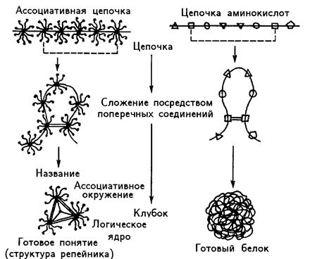 Модель образования понятия в метафорах Г. Шефера. Слева – возникновение понятия из ассоциативной цепочки, справа – генезис белка. Рисунок из книги «Синергетическая парадигма. Многообразие поисков и подходов. М., 2000
