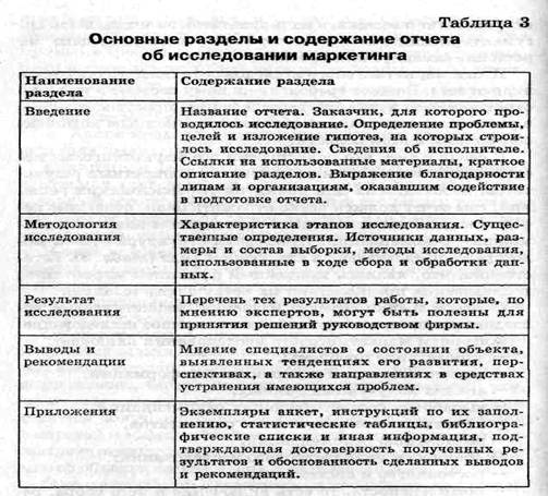 Исходным пунктом маркетингового исследования является точная формулировка его целей и задач. Они прямо вытекают из специфической проблемы, актуальной для фирмы в тот или иной промежуток времени. На рынке предприятию зачастую приходится сталкиваться со снижением объемов продаж на определенном сегменте. Эта проблема требует проведения специального исследования, цели которого могут быть сформулированы в виде следующих вопросов: ♦ Каковы причины уменьшения реализации продукции на рассматриваемом рынке? ♦ Какие меры необходимо предпринять для противодействия выявленной тенденции? Конкретная цель диктует выбор главных направлений и объемов исследования с точки зрения предмета (весь товарный ассортимент или отдельные его виды), размера территории (городской район, область или регион), периода времени, охваченного исследованием. В ряде случаев при формировании этого этапа выполняются предварительные (неформальные) исследования маркетинга для получения данных, позволяющих уточнить содержание имеющей место проблемы и цели предстоящего изучения. 1.Отбор источников информации осуществляется с целью облегчения задачи поиска необходимых сведений. Правильный выбор источников освобождает от излишних усилий по сбору данных, бесцельных поисков нужных сведений там, где их заведомо не может быть. Основной задачей при этом является получение необходимых данных с максимальной быстротой и эффективностью. Всю информацию можно рассматривать как совокупность первичных и вторичных данных об объекте исследования и окружающей его среды. 2.Сбор информации в зависимости от особенностей объекта исследования предполагает использование методов изучения рынка, товара, конкурентов, потребителей и т. д. 3.Анализ собранной информации предполагает ее изучение, переработку с помощью различных методов и приемов, а также извлечение необходимых сведений из всего массива полученных данных. При этом широко используются экономико-статистические и экономико-математические методы обработки информации. 4.Представление результатов исследования предполагает разработку выводов и рекомендаций. Они должны непосредственно вытекать из результатов анализа, быть аргументированными и достоверными, направленными на решение исследуемых проблем. Итоги маркетингового исследования представляются в виде отчета. Важное требование к нему состоит в том, что отчет пишется в легкодоступной форме, простым языком, в расчете на человека, не обладающего полным комплексом знаний в этой области. В связи с тем, что практически все маркетинговые исследования направлены на получение конкретных результатов, необходимых для принятия управленческих решений, сам отчет должен четко отражать цели, стоявшие перед исследованием, выводы о проведенном анализе и возможные рекомендации. Примерная структура отчета может быть представлена в следующем виде (табл. 3).