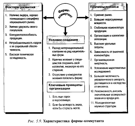 Закат монополии связан с состоянием, по образному выражению, «неповоротливого бегемота». Сохраняя гигантский оборот, фирма постепенно утрачивает способность добиваться соразмерной прибыли, а то и начинает приносить убытки. Причиной такого этапа развития может быть и часто бывает распыление активности по слишком широкому кругу направлений, усложнение организационной структуры, омертвление значительной части капитала в утративших перспективу производствах. Но ситуация не является безнадежной. Выход состоит, как правило, в дезинвестициях, в безжалостном избавлении от убыточных производств и снижении издержек в сохраняемых предприятиях. Уменьшив свои размеры, фирма получает возможность финансового оздоровления. При этом возможна и такая ситуация. Попавшая в полосу кризисного развития фирма нередко утрачивает самостоятельность или медленно переходит на второстепенные роли в экономическом развитии, превращаясь в деструктурированный виолент. Четвертый этап называется коммутантным. Он представляет собой состояние фирмы в период упадка, старения, когда наиболее значимые параметры жизнедеятельности заметно ухудшаются, а развитие, понимаемое как дальнейшее совершенствование, теряет смысл, заходит в тупик. Структура имеет тенденцию к упрощению, свертыванию, а выросшие и окрепшие конкуренты занимают большее жизненное пространство и более эффективны. Так появляются фирмы-коммутанты, осуществляющие средний и малый бизнес, ориентированный на удовлетворение конкретных региональных потребностей, индивидуализированный подход к клиентам, использование достижений фирм-виолентов. Коммутанты работают на этапе падения цикла выпуска какого-либо вида продукции. Как правило, это фирмы, отжившие свой век и занимающиеся выпуском продукции или услуг, либо частично устаревших, либо имеющих ограниченный спрос в рамках только национального или регионального рынка. Это могут быть как крупные и средние, так и малые фирмы. Их научно-техническая политика требует принятия решений о своевременной постановке продукции на производство, о степени технологической освоенности изделий, выпускаемых «полентами, о целесообразных изменениях в них согласно требованиям специфических потребителей (рис. 5.9).