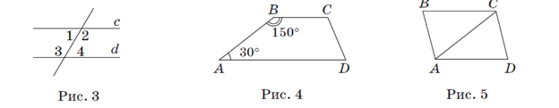 Актуализация опорных знаний Выполнить задания 1. Укажите пары внутренних накрест лежащих углов и пары внутренних односторонних углов на рис. 3. Являются ли прямые c и d параллельными, если: а) ∠1 =∠4; б) ∠1 = 60°, ∠3 =120°? 2. На рис. 4 ∠ A = 30°, ∠ B =150°. Докажите что BC AD. 3. AC — диагональ четырехугольника ABCD (рис. 5). Докажите, что BC ǁ AD и AB ǁ CD, если Δ ABC =Δ CDA.