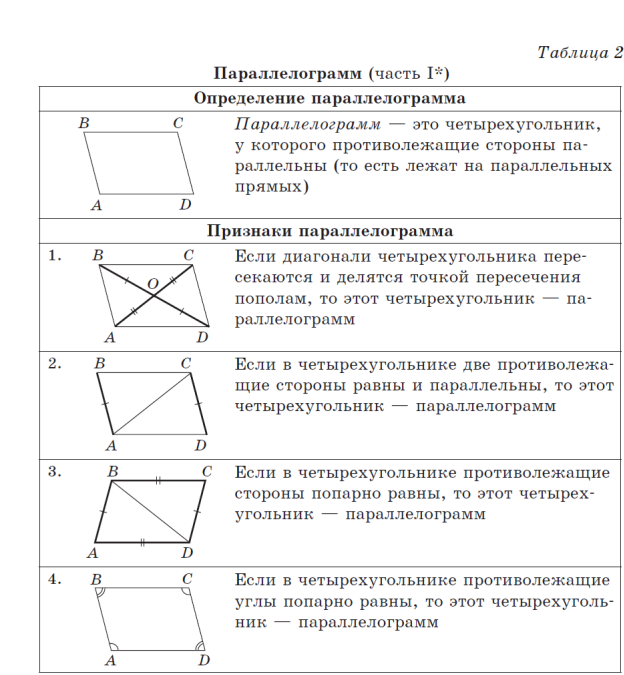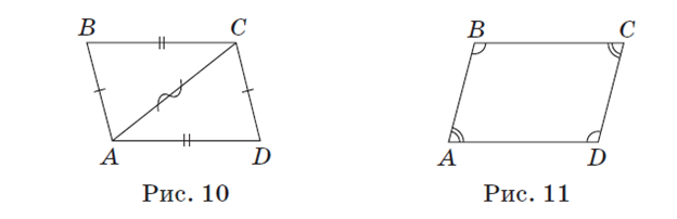и AD и секущей AC, то BC ǁ AD. Следовательно, AB ǁ CD, BC ǁ AD. Таким образом, в четырехугольнике ABCD противолежащие стороны параллельны, следовательно, он параллелограмм по определению, что и требовалось доказать. Задача 3 (признак 3). Если в четырехугольнике противолежащие стороны попарно равны, то этот четырехугольник — параллелограмм. Доказательство Пусть в четырехугольнике ABCD (рис. 10) AB = CD, BC = AD. В данном четырехугольнике проведем диагональ AC. В треугольниках ABC и CDA: AB = CD, BC = AD — по условию, AC — общая сторона. Значит, Δ ABC =Δ CDA по трем сторонам. Отсюда ∠ BAC =∠ DCA, ∠ BCA =∠ DAC как соответствующие углы равных треугольников. Поскольку углы BAC и DCA — внутренние накрест лежащие при прямых AB и CD и секущей AC, а углы BCA и DAC — внутренние накрест лежащие при прямых BC и AD и секущей AC, то соответственно AB CD, BC AD. Следовательно, четырехугольник ABCD —параллелограмм по определению, что и требовалось доказать. Задача 4 (признак 4). Если у четырехугольника противолежащие углы попарно равны, то этот четырехугольник — параллелограмм. Доказательство Как уже было доказано, сумма углов любого четырехугольника равна 360º. Пусть в четырехугольнике ABCD (рис. 11) ∠ A+ ∠ C, ∠ B =∠ D. Так как ∠ A +∠ B +∠ C +∠ D =360º, то 2(∠ A +∠ B) =360º. Отсюда ∠ A +∠ B =180º. Поскольку углы A и B — внутренние односторонние при прямых BC и AD и секущей AB, то BC AD по признаку параллельности прямых. Аналогично ∠ A +∠ D =180º, а значит, AB ǁ CD. Следовательно, четырехугольник ABCD — параллелограмм по определению, что и требовалось доказать.