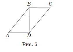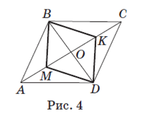 Значит, AB =2⋅ AK =2 x (см). P ABCD = AB+BC+CD+AD = 2 x ⋅4=8, 8 x =48, x =6. Следовательно, AB = BC = CD = AD =6⋅2 =12 (см). Рассмотрим треугольник ABD. Это равнобедренный треугольник с основанием AD, так как высота BK является его медианой. Значит, BD = AB =12 см. Ответ: 12 см. Задача 5. В параллелограмме ABCD (рис. 4) на диагонали AC отложены равные отрезки AM и CK. Докажите, что четырехугольник BMDK — параллелограмм.