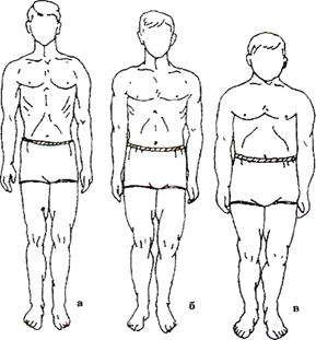 При определении типа телосложения обращают внимание на развитие и соотношение таких признаков, как форма спины грудной клетки, живота, ног, стопы, степень развития костной, мышечной и жировой тканей. На телосложение влияет вид спорта, питание, окружающая среда (климатические условия) и другие факторы. Существуют различные классификации типов соматической конституции. Классификация морфотипов по М. В. Черноруцкому включает астенический, нормостенический и гиперстенический типы телосложения (см. рис. 3).