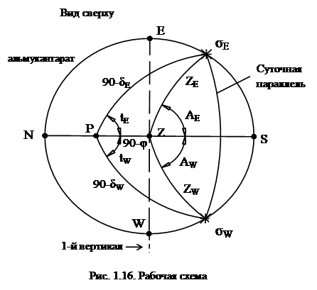 Данный способ относится к группе способов равных высот. Задача состоит в определении времени из наблюдений двух звезд на одном альмукантарате в плоскости 1-го вертикала. Разрешается наблюдать звезды на удаление по азимуту от 1-го вертикала до 30º. Одна звезда наблюдается на востоке (sE), другая на западе (sW). Для упрощения математической обработки наблюдений, пары звезд выбирают так, чтобы они были симметричны по азимуту относительно плоскости меридиана. В функции азимутов звезд условие симметричности имеет вид AE = 360° – AW. (1.62) Графическое изображение условий симметричного выбора звезд в парах относительно меридиана показано на рис. 1.16. Уравнение поправок для пары звезд