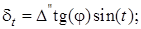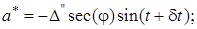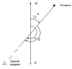 где а – азимут земного предмета, отсчитанный от точки Севера; a* – азимут Полярной от точки Севера; Q – горизонтальный угол, измеренный теодолитом между направлениями на Полярную звезду и направлением на земной предмет; t – часовой угол Полярной звезды, вычисляемый по декретному времени; α и δ – экваториальные координаты Полярной звезды, выбираемые из АЕ таблицы «Видимые места близполюсных звезд» [2]; d t – поправка в часовой угол; n – номер часового пояса (n = 2h); к – декретная добавка, для РБ зимой к = 0; М – всемирное время на меридиане Гринвича; λ – долгота на начальном меридиане; Δ – Полярное расстояние, вычисляемое по склонению Полярной звезды. Допустимое расхождение между приемами 40²[7].