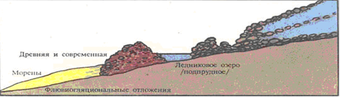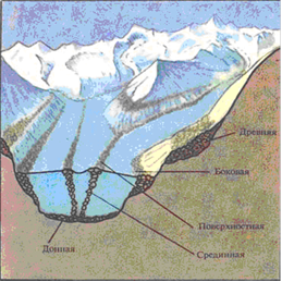 Среди ледниковых выделяются три типа морен: основная (донная); абляционная; конечная (краевая).