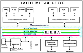 Основные узлы системного блока: электрические платы, руководящие работой компьютера (микропроцессор, оперативная память, контроллеры устройств и т.п.); накопитель на жестком диске (винчестер), предназначенный для чтения или записи информации; накопители (дисководы) для гибких магнитных дисков (дискет). Основной платой ПК является материнская плата (MotherBoard). На ней расположенны: процессор - основная микросхема, выполняющая математические и логические операции; чипсет (микропроцессорный комплект) - набор микросхем, которые руководят работой внутренних устройств ПК и определяют основные функциональные возможности материнской платы; шины - набор проводников, по которым происходит обмен сигналами между внутренними устройствами компьютера; оперативное запоминающее устройство (ОЗУ) - набор микросхем, предназначенных для временного сохранения данных, пока включен компьютер; постоянное запоминающее устройство (ПЗУ) - микросхема, предназначенная для долговременного хранения данных, даже при отключенном компьютере; разъемы для подсоединения дополнительных устройств (слоты).