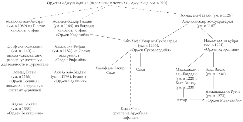 Все последователи тариката более или менее свободно признавали главенство духовного или (чаще) физического потомка отца‑основателя, его преемника (халифа, отвечавшего за его ханаку или могилу). Иногда отношения были в основном церемониальными – все приверженцы суфийского учения, берущего начало от конкретного отца‑основателя, старались собираться на его могиле в годовщину смерти, чтобы вспомнить о нем и получить новый заряд сил для духовного роста. Но иногда обладатель верховной власти весьма плотно контролировал всех признававших его пиров. Тот, кто сменял основателя на его посту, обычно получал возможность контролировать финансовые поступления значительных размеров. И хотя большинство пиров отказывались использовать деньги для комфорта, своего или своей семьи, распределение средств на благотворительные нужды подразумевало необходимость делать выбор, в том числе выбор ответственных за это распределение, что неизбежно определяло положение членов тариката по отношению друг к другу. Эти соображения повышали важность выбора преемника великого пира (и ими же объяснялось предпочтение из всех учеников сыну пира, если таковой существовал, поскольку он с большей вероятностью будет сохранять нейтралитет в отношениях с разными группами, на которые всегда делится любое объединение людей, даже тех, кто пытается идти путем мистицизма). Слишком часто смерть пира при отсутствии заранее определенного преемника приводила к расколу в ордене, когда два ведущих ученика делили остальных на противоположные группировки и называли друг друга отступниками. Главный пир назначал не только халифу, который должен был сменить его, но часто нескольких халиф, способных так или иначе руководить функционированием ордена. Их отправляли в города, где еще не проповедовалось учение данного пира и где халифа выступал в роли миссионера, который должен был снискать расположение местной публики (как в моральных, так и в финансовых целях) и обрести мюридов из числа местного населения. Пока авторитет верховного пира был непререкаем, халифа в другом городе не мог самостоятельно назначать халиф или переезжать в другой город с более заманчивыми перспективами, не получив одобрения своего начальника (по крайней мере, молчаливого). Самым знаменитым и, пожалуй, всегда наиболее распространенным из таких тарикатов был орден Кадирийя, чья сильсиля восходила к проповеднику Абд‑аль‑Кадиру Гилани. Сам он не имел намерений основывать какой‑либо орден или назначать себе преемника в этом смысле. Но плащ‑хирку, символ духовной зрелости, он подарил многим своим ученикам. После его смерти появился пост руководителя его ханаки и распределителя накопленных пожертвований в его имя. Наконец, не только его ученики, но и ученики учеников обращались к его авторитету и авторитету его преемников (халиф) на его могиле в Багдаде в движении по мистическому пути. Так лидерство, изначально основанное на личной харизме, было возведено в институт. Значимым стал авторитет основателя, а не его взгляды. И в этом смысле следовало произвести впечатление не только на практикующих мистиков, но и на неуверенных в себе учеников, и даже на широкие массы. Согласно стандартной биографии Гилани, написанной век спустя, он был величайшим чудотворцем, и вся его практическая работа и пропов