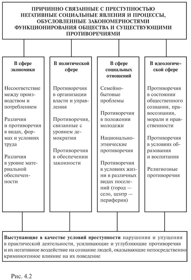 Представления о причинах преступности в нашей стране претерпели в последние десятилетия значительные изменения. Длительное время в условиях советской системы вообще отрицалось существование присущих социалистическому обществу социальных причин преступности. Она объяснялась лишь пережитками прошлого и негативным влиянием капиталистического окружения. Изучение причинного комплекса преступности в современной России свидетельствует о несводимости ее истоков, корней к какой‑либо монопричине. В качестве причин преступности выступают негативные социальные явления и процессы, коренящиеся в самом обществе, имеющие объективный характер, обусловленные закономерностями его функционирования. При этом наиболее важными причинами и условиями современной преступности являются указанные явления и процессы в сферах экономики, политики, социальных отношений, идеологии (см. рис. 4.2). Исходными среди них выступают экономические и тесно связанные с ними распределительные отношения.