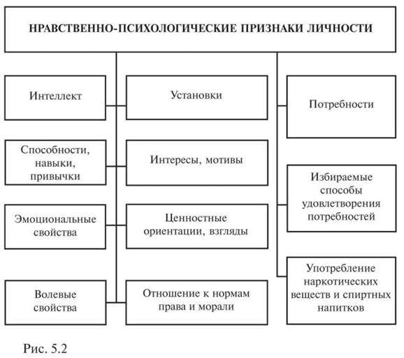 Характеристику личности дополняют его интеллектуальные, эмоциональные и волевые свойства, в которых проявляется тесная связь биологического и социального. К интеллектуальным свойствам относятся: уровень умственного развития, объем знаний, широта или узость взглядов, содержание и разнообразие интересов и стремлений, жизненный опыт и т. д. Эмоциональные свойства состоят из таких признаков, как сила, уравновешенность или подвижность нервных процессов, динамичность чувств, степень эмоциональной возбудимости, характер реагирования на различные проявления внешней среды и т. д. Волевые свойства включают: способность принимать и осуществлять принятые решения, умение регулировать свою деятельность и направленность поступков, обладание выдержкой, стойкостью, твердостью, настойчивостью и другими чертами. Все перечисленные признаки и свойства характерны как для личности в общепринятом понимании ее сущности, так и для личности преступника. Наиболее важной в понимании специфики личности преступника является уголовно‑правовая характеристика. Именно она отражает степень социальной деформации личности, ее особые свойства, позволяет выделить наиболее существенные признаки лиц, совершивших преступления. К числу таких признаков относятся: направленность и мотивация преступных действий, длительность, интенсивность преступной деятельности и наличие судимостей за нее, ролевое участие в конкретном преступлении, степень подготовленности (организованности) к преступлению, отношение к его последствиям (см. рис. 5.3).