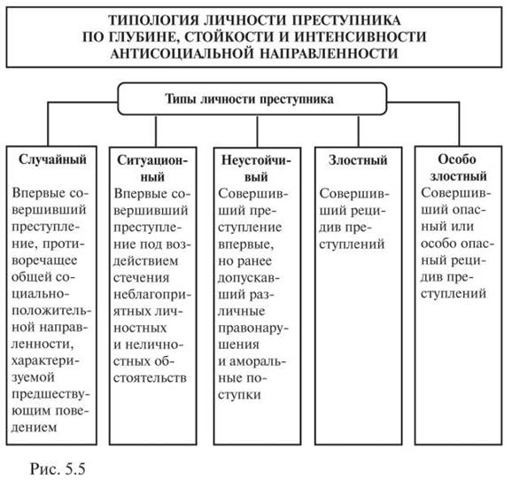 Для лиц, относящихся к третьей типологической группе, характерно уклонение от выполнения своих гражданских, семейных, общественных и должностных обязанностей. Лица, входящие в эту группу, уклоняются от уплаты средств на содержание детей или нетрудоспособных родителей, злоупотребляют служебным положением, совершают ряд преступлений против порядка управления, правосудия, воинские преступления и т. п. Лицам четвертой типологической группы присуще совершение различных неосторожных преступлений. По глубине, стойкости и интенсивности антисоциальной направленности в криминологии принято выделять следующие типы преступников: случайный, ситуационный, неустойчивый, злостный и особо злостный (см. рис. 5.5).
