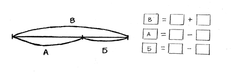 В беседе со школьниками по этой матрице следует задавать противопо-ложные по содержанию вопросы. Вопрос: какая лента нарисована в правой нижней клетке? Ответ: длинная и узкая. Вопрос: где нарисована короткая и широкая лента? Ответ: в левой верхней клетке. Табличные примеры удобны для быстрого решения примеров, информационно связанных друг с другом (рис.3). Так, например, заполняя клетки таблицы, школьники должы обратить внимание на совпадение парных сумм, например: 35+47=45+37=82.