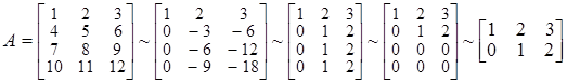 Разберем преобразования матрицы 1) ко второй строке прибавим первую, умноженную на 2) разделим все элементы второй строки на 3) к третьей и четвертой строкам прибавим вторую, умноженную на 4) вычеркнем третью и четвертую строки, состоящие только из нулей; В результате данных преобразований остались две различные строки. В качестве базисного минора возьмем определитель Вопрос о совместности системы (1) полностью решается следующей теоремой: Для того, чтобы система линейных уравнений была совместной, необходимо и достаточно, чтобы ранг матрицы этой системы был равен рангу ее расширенной матрицы. Пусть для системы