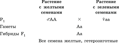 Успех работы Грегора Менделя был связан с тем, что он правильно выбрал объект исследования и соблюдал принципы, ставшие основой гибридологического метода: 1. Объектом исследования стали растения гороха, принадлежавшие к одному виду. 2. Опытные растения четко отличались по своим признакам – высокие – низкие, с желтыми и зелеными семенами, с гладкими и морщинистыми семенами. 3. Первое поколение от исходных родительских форм всегда было одинаковым. Высокие родители давали высокое потомство, низкие родители давали растения маленького роста. Таким образом, исходные сорта были так называемые «чистые линии». 4. Г. Мендель вел количественный учет потомков второго и последующих поколений, у которых наблюдалось расщепление в признаках. Законы Г. Менделя описывают характер наследования отдельных признаков на протяжении нескольких поколений. Первый закон Менделя или правило единообразия. Закон выведен на основе статистических данных, полученных Г. Менделем при скрещивании разных сортов гороха, имевших четкие альтернативные различия по следующим признакам: – форма семени (круглая / некруглая); – окраска семени (желтая / зеленая); – кожура семени (гладкая / морщинистая) и т.д. При скрещивании растений с желтыми и зелеными семенами Мендель обнаружил, что все гибриды первого поколения оказались с желтыми семенами. Он назвал этот признак доминантным. Признак, определяющий зеленую окраску семян, был назван рецессивным (отступающим, подавленным). Так экзаменационная работа требует от учащихся умения правильно оформлять записи при решении генетических задач, то мы покажем пример такой записи.