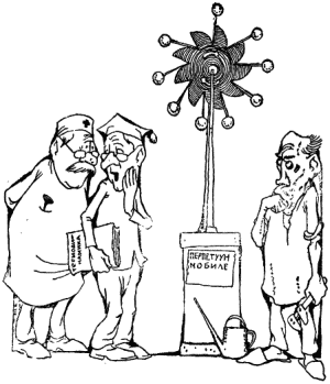 Закон сохранения энергии вряд ли можно рассматривать как чисто опытное правило. В законе содержатся два утверждения: первое – энергию нельзя получить из ничего, и второе – энергия не может бесследно пропасть. Первая половина этого утверждения известна как закон невозможности вечного двигателя (перпетуум‑мобиле). Уже давно человечество пришло к досадному заключению, что создание двигателя, который ничем не питается, вещь невозможная. Да и человеческой психологии представляется весьма естественным положение, что «без труда не выловишь и рыбку из пруда». Поэтому осуществление вечного двигателя представлялось научным деятелям средних веков задачей столь же божественной, как и изобретение философского камня или живой воды. Однако многие наши научные предшественники не рассуждали согласно логике XX века. Признавая, что получение энергии из ничего противоречит всему, чему учит жизнь, они тем не менее отважно пускались на поиск вечного движения. Об осуществлении перпетуум‑мобиле мечтает Бертольд, герой «Сцен из рыцарских времен» Пушкина. «Что такое перпетуум‑мобиле?» – спрашивает его собеседник. «Это вечное движение, – отвечает тот. – Если найду вечное движение, то я не вижу границ творчеству человека. Делать золото – задача заманчивая, открытие может быть любопытное, выгодное, но найти разрешение перпетуум‑мобиле…» Вечный двигатель – это машина, которая должна не только преодолевать неизбежно возникающие силы трения, но и вращать колеса или подымать грузы снизу вверх. Работа эта должна происходить вечно и непрерывно, а двигатель не должен требовать ни топлива, ни рук человеческих, ни энергии падающей воды – словом, ничего взятого извне. Первый в истории, дошедший до наших дней, достоверный документ об «осуществлении» идеи вечного двигателя относится к XIII веку. Любопытно, что спустя шесть веков, в 1910 году, в одно из московских научных учреждений был представлен на «рассмотрение» «проект» буквально такого же двигателя. Мы помещаем его изображение на этой странице и думаем, что многие с ним знакомы. При вращении колеса грузы перекидываются вправо и поддерживают, по мысли изобретателя, тем самым движение, так как откинувшиеся грузы давят гораздо сильнее, действуя на более далеком от оси расстоянии (большее плечо). Построив эту отнюдь не сложную «машину», изобретатель убеждается, что, повернувшись по инерции на один или два оборота, колесо останавливается. Но это не приводит его в уныние. Он думает, что где‑то допущена ошибка и достаточно удлинить рычаги или изменить форму выступов, как машина заработает. И бесплодная работа, которой многие доморощенные изобретатели посвящали всю свою жизнь, продолжается, но, разумеется, с тем же успехом.