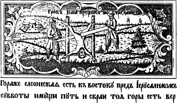 В свете того, что мы узнали о Цицероне, зададимся вопросом: сохранились ли подлинные его произведения? То есть тексты Иоанна Крестителя? Конечно, сегодня нам предъявят объемистые и многословные труды под именем Цицерона. Однако, скорее всего, они являются поздними редакциями или даже подделками, написанными в XVII–XVIII веках. По‑видимому, подлинные произведения Иоанна Крестителя (Цицерона) следует поискать в церковной литературе. Однако считается, что церковная традиция не сохранила ни произведений Иоанна Крестителя, ни сведений о том, существовали ли они вообще. Все, что мы знаем – несколько фраз Иоанна Крестителя, содержащихся в Евангелиях. Вот, например: «В те дни приходит Иоанн Креститель и проповедует в пустыне Иудейской и говорит: покайтесь, ибо приблизилось Царство Небесное. Ибо он тот, о котором СКАЗАЛ ПРОРОК ИСАЙЯ: глас вопиющего в пустыне: приготовьте путь Господу, прямыми сделайте стези Его» (Матфей 3:1–3). Итак, согласно Матфею, Иоанн Креститель «цитирует» пророка Исайю. Выскажем следующем мысль. Не исключено, что знаменитая книга Исайи, входящая в Ветхий Завет – это и есть уцелевший подлинный текст Иоанна Крестителя – «античного» Цицерона. Автор назван ИСАЙЕЙ в смысле «Предтеча ИИСУСА». В библеистике давно отмечена исключительная близость ветхозаветного пророчества Исайи к Новому Завету. Иногда его книгу даже называют Пятым Евангелием. Так например, Энциклопедический Словарь Брокгауза и Ефрона сообщает: «ПОДЪЕМ религиозно‑нравственного смысла в иудейском народе… несомненно был результатом неутомимой деятельности пророка (Исайи – Авт.), который… СМЕЛО И БЕЗБОЯЗНЕННО ГОВОРИЛ ПРАВДУ ЦАРЯМ. По преданию, он потерпел МУЧЕНИЧЕСКУЮ КОНЧИНУ И БЫЛ РАСПИЛЕН ДЕРЕВЯННОЙ ПИЛОЙ. Под его именем известна особая книга, которая стоит в Библии ВО ГЛАВЕ ТАК НАЗЫВАЕМЫХ ЧЕТЫРЕХ ВЕЛИКИХ ПРОРОКОВ. Книга пророка Исайи состоит из 66 глав и представляет собой богатый материал… ОСОБЕННУЮ ЗНАМЕНИТОСТЬ в христианской церкви он приобрел своим пророчеством о Мессии (Еммануиле: гл. VII и IX); ПРОРОК ТАК ТОЧНО И НАГЛЯДНО ИЗОБРАЖАЕТ СОБЫТИЯ ЗЕМНОЙ ЖИЗНИ ХРИСТА, ЧТО ПОЛУЧИЛ НАЗВАНИЕ ПЯТОГО ЕВАНГЕЛИСТА» [988:00]. Итак, Исайя, как и Иоанн Креститель, был предшественником Христа и предсказывал его пришествие. Подобно Иоанну Крестителю, пророк Исайя не боялся власть имущих и смело говорил правду царям в глаза. Иоанн Креститель поплатился за это жизнью. Исайя тоже был казнен, рис. 1.91.