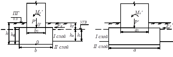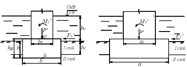 Фундамент под опору с размерами а0 и в0 в плане рассчитывается на нагрузки вдоль и поперек оси моста (табл. 1.1). Грунтовые условия для проектирования фундамента на местности, покрытой и не покрытой водой, приведены в табл. 1.2.