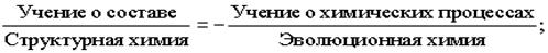 Рис.1. На рисунке показано последовательное появление новых, концепций в химической науке, которые опирались на предыдущие достижения, сохраняя в себе все необходимое для дальнейшего развития. Даже невооруженным взглядом в этих этапах видна симметрия этапов. В левой части тождества отношение отражает структурный аспект эволюции химии, правая часть тождества, напротив, отражает уже функциональный (процессы) аспект эволюции химии. Исследование элементарного и молекулярного составов веществ (учение о составе вещества) Учение о составе веществ является первым уровнем химических знаний. До 20-30-х гг. XIX в. вся химия не выходила за пределы этого подхода. Но постепенно рамки состава (свойств) - стали тесны химии, и во второй половине XIX в. главенствующую роль в химии постепенно приобрело понятие «структура», ориентированное, что и отражено непосредственно в самом понятии, на структуру молекулы реагента. Химическим соединением называется атомно-молекулярная система, обладающая следующими признаками: 1) содержанием большего числа атомов ограниченного числа «сортов»; 2) каждому сорту атомов соответствует определенная координация постоянных, определяющих индивидуальность химического соединения, распределение атомов по сортам (состав); 3) способностью существовать в виде одного или нескольких химических веществ. На этом уровне решались вопросы определения химического элемента, химического соединения и получения новых материалов на базе более широкого использования химических элементов. Первое научное определение химического элемента, когда еще не было открыто ни одного из них, сформулировал английский химик и физик Р. Бойль. Первым был открыт химический элемент фосфор в 1669 г., потом кобальт, никель и другие. Открытие французским химиком А. Л. Лавуазье кислорода и установление его роли в образовании различных химических соединений позволило отказаться от прежних представлений об «огненной материи» (флогистоне). В Периодической системе Д.И. Менделеева насчитывалось 62 элемента, в 1930-е гг. она заканчивалась ураном. В 1999 г. было сообщено, что путем физического синтеза атомных ядер открыт 114-й элемент. Вопросы, связанные с химическими соединениями, длительное время не вызывали споров в среде химиков. Казалось очевидным, что именно относится к химическим соединениям, а что - к простым телам или смесям. В результате химических и физических открытий претерпело изменение классическое определение молекулы. Молекула понимается как наименьшая частица вещества, которая в состоянии определять его свойства и в то же время может существовать самостоятельно. Представления о классе молекул расширились, в него включают ионные системы, атомные и металлические монокристаллы и полимеры, образующиеся на основе водородных связей и представляющие собой уже макромолекулы. Они обладают молекулярным строением, хотя и не находятся в строго постоянном составе. С открытием физиками природы химизма как обменного взаимодействия электронов химики совершенно по-другому стали рассматривать химическое соединение. «Это качественно определенное вещество, состоящее из одного или нескольких химических элементов, атомы которых за счет обменного взаимодействия (химической связи) объединены в частицы-молекулы, комплексы, монокристаллы или иные агрегаты. Х