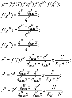 Значения всех констант ( Как уже было сказано, скорость роста зависит от концентрации биогенных веществ. Для фитопланктона элементами, способными лимитировать рост, могут являться, например, азот, фосфор и углерод. Возможные способы отражения этого факта в работе С.Йоргенсена описаны следующим образом