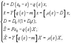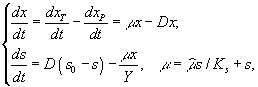 где Существуют некоторые данные, которые позволяют сравнить результаты моделирования с использованием концепции клеточной квоты и без ее использования. Л.А.Кучай (Кучай, 1985) специально сравнивала модели, описывающие кругооборот биогенных ресурсов (азота или азота и фосфора) в замкнутой системе, включающей одну группу фитопланктона, питательные элементы и детрит. При использовании клеточной квоты удельная скорость роста задавалась формулой Друпа, при этом в случае двух ресурсов использовался принцип минимума Либиха. Оказалось, что модели с использованием клеточной квоты дают большее число возможных сценариев развития фитопланктона и позволяют описывать ситуации, реально встречающиеся в природе, например, ситуацию нарастания биомассы фитопланктона в условиях почти нулевой концентрации биогенного элемента в среде или ситуацию резкого скачка отношения N:P в среде в момент кульминации цветения. В настоящее время среди исследователей установилось мнение, что модель Моно адекватна при описании устойчивого роста водорослей в стационарных условиях, подобных хемостату, а для описания процесса роста при изменяющихся внешних условиях, например, при моделировании внутригодовой сукцессии фитопланктона, необходима более сложная модель, выбранная в соответствии с предположением зависимости скорости роста от клеточных концентраций ресурсов. Одной из ситуаций, где при моделировании необходимо привлечение концепции клеточной квоты, является накопительное культивирование.[1] Дифференциальные уравнения в микробиологии. Дифференциальные уравнения, описывающие и концентрации микробной биомассы (x) и концентрации лимитирующего субстрата (s) в условиях хемостатного культивирования, которые были выведены Ж.Моно исходя из условий материального баланса, составили первую модель роста микробных популяций.