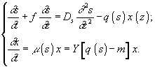 Применяют также обычное гомогенное периодическое культивирование и воспроизведение пространственно-неоднородного роста микроорганизмов: а) культура полного вытеснения f – скорость перемещения малого элемента культуральной жидкости по пространственной координате z; Ds и Dx – коэффициенты диффузии для субстрата и клеток; б) проточный реактор с иммобилизованными клетками