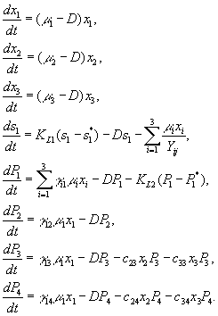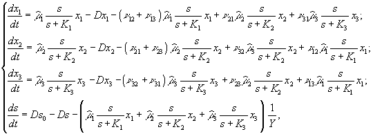 где x1, x2, s – концентрации двух видов фитопланктона и минерального вещества, выраженные в единицах лимитирующего биогенного вещества; Как уже указывалось выше, при моделировании динамики биомассы фитопланктона, чаще всего используют уравнение Моно, описывающее зависимость удельной скорости роста популяции μ от концентрации s лимитирующего рост субстрата