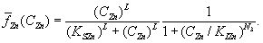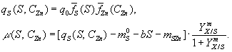 В приведенных формулах CZn обозначает внешнюю концентрацию цинка, CZn1 и CZn2 – внутреннюю концентрацию цинка, S – концентрацию этанола; Предлагаемая модель обеспечивает высокую степень соответствия экспериментальным данным и объясняет многие особенности поведения культуры. По мнению авторов, описанные зависимости могут применяться ко многим органическим и минеральным субстратам, в том числе обладающим токсическим действием на микроорганизмы.[4]