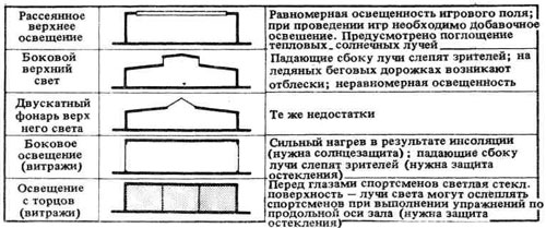Расположение спортивных залов в городе зависит от их назначения (имеют ли они универсальный характер или предназначены только для занятий спортом) и от спортивных традиций страны, региона или города. Необходимо обеспечить удобные транспортные связи, достаточную площадь для автомобильных стоянок, удобную связь с другими спортивными сооружениями. Назначение зала: по возможности универсальное (многоцелевое). Размеры и форма зала. Размеры зала зависят от величины игрового поля. Игровое поле размером 20 х 40 м необходимо дня следующих игр: хоккей на роликах, хоккей, гандбол, теннис, баскетбол, волейбол, бадминтон, волейбол и поло на велосипеде. Поле таких размеров пригодно также для фигурного катания, настольного тенниса, бокса, борьбы, фехтования, дзюдо, тяжелой атлетики, а также некоторых легкоатлетических дисциплин (толкание ядра, прыжки в длину, высоту и в высоту с шестом) и гимнастических упражнений. Высота зала в зависимости от его размеров может составлять в свету 7 - 15 м. Перекрытие зала чаще всего имеет арочное очертание с подъёмом дуги в зоне максимальной высоты полета мяча. В зале не должно быть промежуточных внутренних колонн. По средней поперечной оси должен быть обеспечен беспрепятственный обзор всего игрового поля. Естественное и искусственное освещение. Требуется равномерная освещенность, характеризуемая отношением E мин / E макс, согласно нормам DIN 5034 («Естественное освещение»); для всех видов игр с мячом требуется мягкое освещение. Освещённость мест для зрителей должна быть меньшей, чтобы игровое поле выделялось. Хорошее общее освещение (150 - 200 лк) при соревнованиях по боксу, борьбе, гимнастике, настольному теннису, фехтованию и т.п. должно дополняться местным направленным освещением (рис. 1).