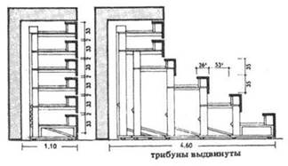 Техническое оборудование (рис. 2). Для проведения соревнований должны быть предусмотрены места для зрителей с отдельным по возможности проходом к ним. Передвижные трибуны для зрителей могут быть встроены в стенные ниши. Желательно предусмотреть в середине зала, напротив трибун для зрителей, табло с указанием времени, микрофон и щиток управления освещением.
