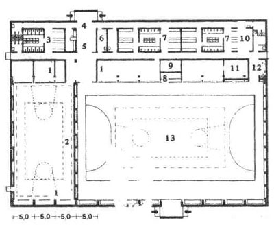 Рис. 3 - Большой и малый спортивные залы при Дармштадтском высшем техническом училище: 1 - снарядная; 2 - малый зал; 3 -мужская раздевальня; 4 -вахтерская; 5 - вестибюль; 6 - комната преподавателей; 7 - раздевальня для мальчиков; 8 - хронометражная, 9 - хранение спортивных костюмов; 10 -машинное отделение; 11 - хранение мячей; 12 - хранение уборочного инвентаря; 13 -большой зал