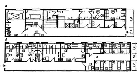 Рис. 5 - Примеры блокировки помещений медико-восстановительного центра (м): а - схема блока водолечебных помещений медико-восстановительного центра; б - схема блока «сухих» помещений медико-восстановительного центра. 1 - душевой зал; 2 - подводный душ-массаж; 3 - раздевальная; 4 - камера бани сухого жара; 5 - душевая с ванной; 6 - комната отдыха; 7 - комната персонала; 8 - кладовая; 9 - кабинет врача (заведующего центром); 10 - процедурная; 11 - массажная; 12 -кабинет для проведения тестов с физической нагрузкой; 13 - кабинет электро- и светолечения; 14 - помещение для обработки прокладок Date: 2015-06-05; view: 617; Нарушение авторских прав |