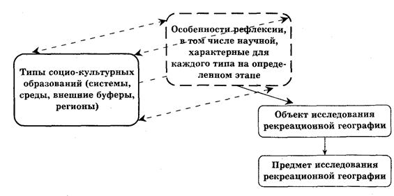 При определении объекта и предмета рекреационной географии важно изначально исходить из следующих тезисов: 1) географическое познание не универсально — оно тесно связано с социокультурными территориальными структурами. Следовательно, в рамках каждого социокультурного образования складывается свое понимание того, что есть объект и предмет рекреационной географии; 2) каждое социокультурное образование имеет собственную логику эволюции. Следовательно, рекреационная география как область научного познания может иметь место далеко не во всех типах образований. Это не показатель развитости или недоразвитости того или иного социокультурного образования, но только показатель его потребности в такой области познания, как рекреационная география. Эти два тезиса важны для понимания относительности объекта и предмета рекреационной географии. Надо избегать неоправданной универсальности в определении объекта и предмета, когда они представляются едиными и неизменными для всех времен и народов. Рекреационная география имеет место лишь в рамках определенного социокультурного образования, и все особенности рекреационной географии определяются именно этим, конкретные формы ее реализации как области познания определяются теми внутренними и внешними задачами, которые решаются социокультурными образованиями в процессе их эволюции. Для более четкой постановки проблемы определения приведем графическую модель (схема 2). Смысл данной модели заключается в том, что существует реальность в виде различных типов социокультурных образований. Для каждого из них характерны свои особенности выражения, и научная рефлексия является только частным