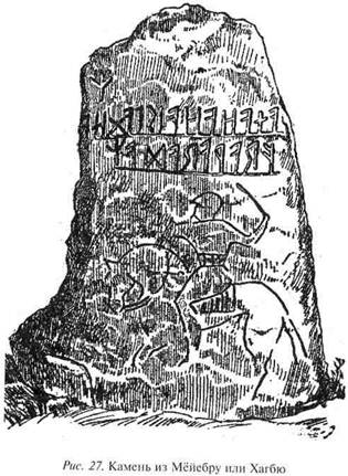 Камень из Мёйебру (Швеция), который датируется временем около 400 г., достоин внимания благодаря динамичному образному изображению всадника с поднятым мечом; кажется, что слева внизу намеком проступает лежащая фигура. На камне повернутая влево надпись из двух строчек, которые поднимаются снизу вверх. Резчик рун не владел искусством распределения пространства, так как ему пришлось поместить над второй строкой ещё
