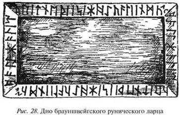 одну букву. Тот факт, что он вырезал G меньше, чем остальные руны, также объясняется недостаточным расчетом свободного места. Руны отчетливо видны. Внизу они представляют собой слово «Frawaradas», т. е. какое-то имя, а наверху — anahahaislaginaz. Последние восемь рун позволяют себя однозначно отделить; они составляют слово slaginaz, то есть «убивать». Мнения по поводу оставшихся восьми знаков очень сильно расходятся. Один исследователь толкует «ana hahai» как «на изгороди», видя в этом название населенного пункта, другой понимает «ana hahai» как «на коне», а третий предполагает, что букву s в slaginaz следует читать удвоенной, и получает вместе с i перед ним словечко is = ist = есть. Таким образом, получаются три варианта толкований: 1. «Фраварадас убит в Хаге (теперь Хагбю)»; 2. «Фраварадас убит на коне»; 3. «Это Фраварадас; Ана Одноглазый убит» (т. е. Фраварадасом). Решение о том, какое из этих толкований заслуживает предпочтения, трудно принять; это в значительной мере обусловлено размышлением о том, был ли камень установлен в честь победы Фраварадаса или в память об убитом Фраварадасе. С учетом всех видов рунических камней, последнее более вероятно. Очень трудным было также чтение и толкование рунической надписи на нижней стороне дна брауншвейгского рунического ларца, который хранится в Музее герцога Антона Ульриха. Это искусно вырезанный ларец с реликвиями, принадлежавший монастырю Гандерсхайма, которому он был подарен супругой Отгона Великого Эдит.
