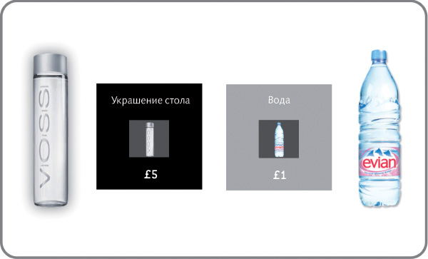 Это обычный гель для душа, обладающий всеми качествами, которые предъявляют к нему покупатели. И только упаковка повышает его чистую ценность при помощи эффекта обрамления. Контекст для употребления этого продукта – мытье в д у ше. Душ принимают ради того, чтобы испытать разные полезные и приятные чувства: взбодриться, успокоиться, проснуться, обновиться и многие другие. Какую роль играет упаковка в выполнении этих задач? Форма флакона напоминает бутылку с машинным маслом. Выемки и фактура для удобства захвата подразумевают контроль. Кроме того, флакон открывается с громким щелчком. Эта упаковка содержит информацию о дополнительной ценности, которая передается через цвет и форму флакона, звук щелчка при открытии и название «Динамичный пульс». Все это вместе работает на подкрепление задачи принятия душа с этим гелем – перезарядиться и быть готовым к активным действиям. Ритуал принятия душа становится эффективнее, поскольку все эти незаметные сигналы обрабатываются одиннадцатью миллионами бит автопилота и повышают чистую ценность продукта в сознании покупателя. В этом примере явные и скрытые ценности идеально соответствуют друг другу, по крайней мере, для тех, кто принимает душ, чтобы взбодриться. Но теми, кто принимает душ, чтобы расслабиться и успокоиться, субъективно этот гель будет цениться меньше, поскольку его предназначение не соответствует их мотивации. Эксплицитную ценность продукта определить проще, потому что можно прямо спросить об этом у покупателей. Однако имплицитной ценности люди часто не замечают и потому не способны о ней судить. Следовательно, они могут недооценивать ее. А ведь имплицитная ценность создает огромный потенциал для необходимой дифференциации продукта на рынке, и скопировать ее конкурентам гораздо сложнее. Что особенного в дизайне Apple? Почему мы сразу узнаем продукты этой компании? Это сложно понять, поэтому и трудно воспроизвести. Предположим, мы ищем способы повысить ценность такого потребительского продукта, как питьевая вода. Первой в голову может прийти мысль о новых добавках, например вкусовых. Идея хороша, но другим производителям ее легко скопировать, стало быть, и конкурентное преимущество от нового вкуса быстро потеряется. Бренд воды Voss из Норвегии был создан с иным подходом (см. рис. 2.3), который значительно повысил субъективную ценность продукта в глазах покупателей, несмотря на то что в «слепых» тестах даже тренированные эксперты по вину не смогли отличить по вкусу Voss от обычной воды, текущей из крана. Но благодаря языку дизайна Voss – это больше, чем просто вода: имплицитная ценность бренда подразумевает, что это украшение стола класса премиум. А дополнительная ценность заключается в установке, что красиво сервированный стол повышает настроение. Вот почему Voss продают в барах и ресторанах. Кроме того, наш автопилот запомнил, что воду этой марки пьют Мадонна и другие знаменитости, потому что она чистая, из Норвегии и подается только в дорогих и шикарных местах.